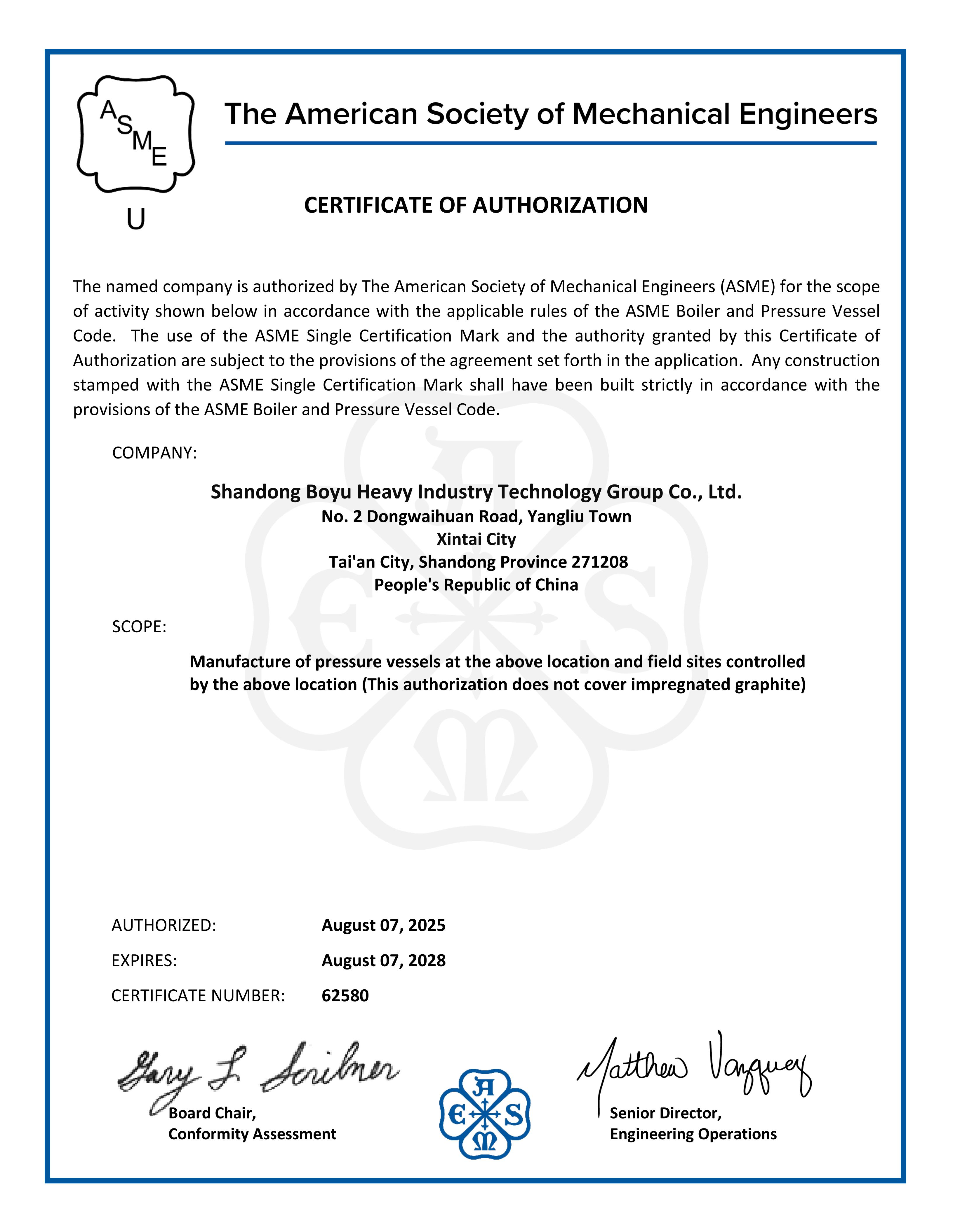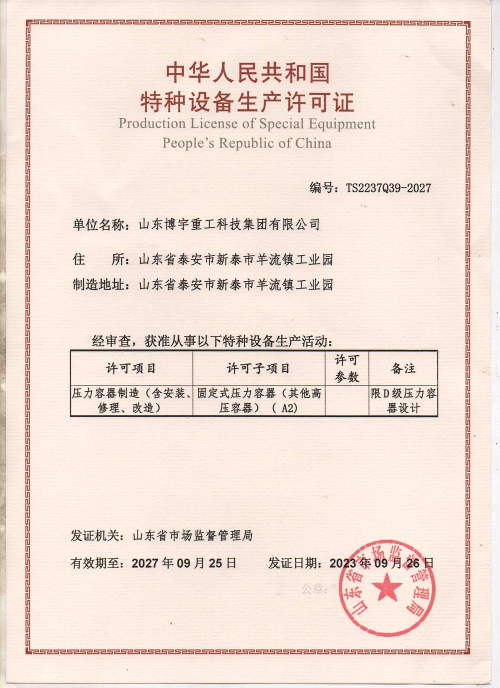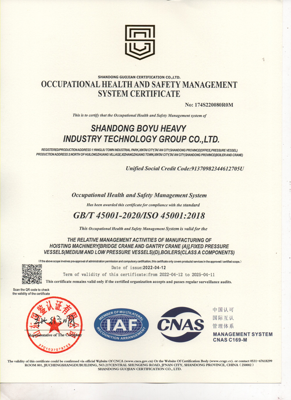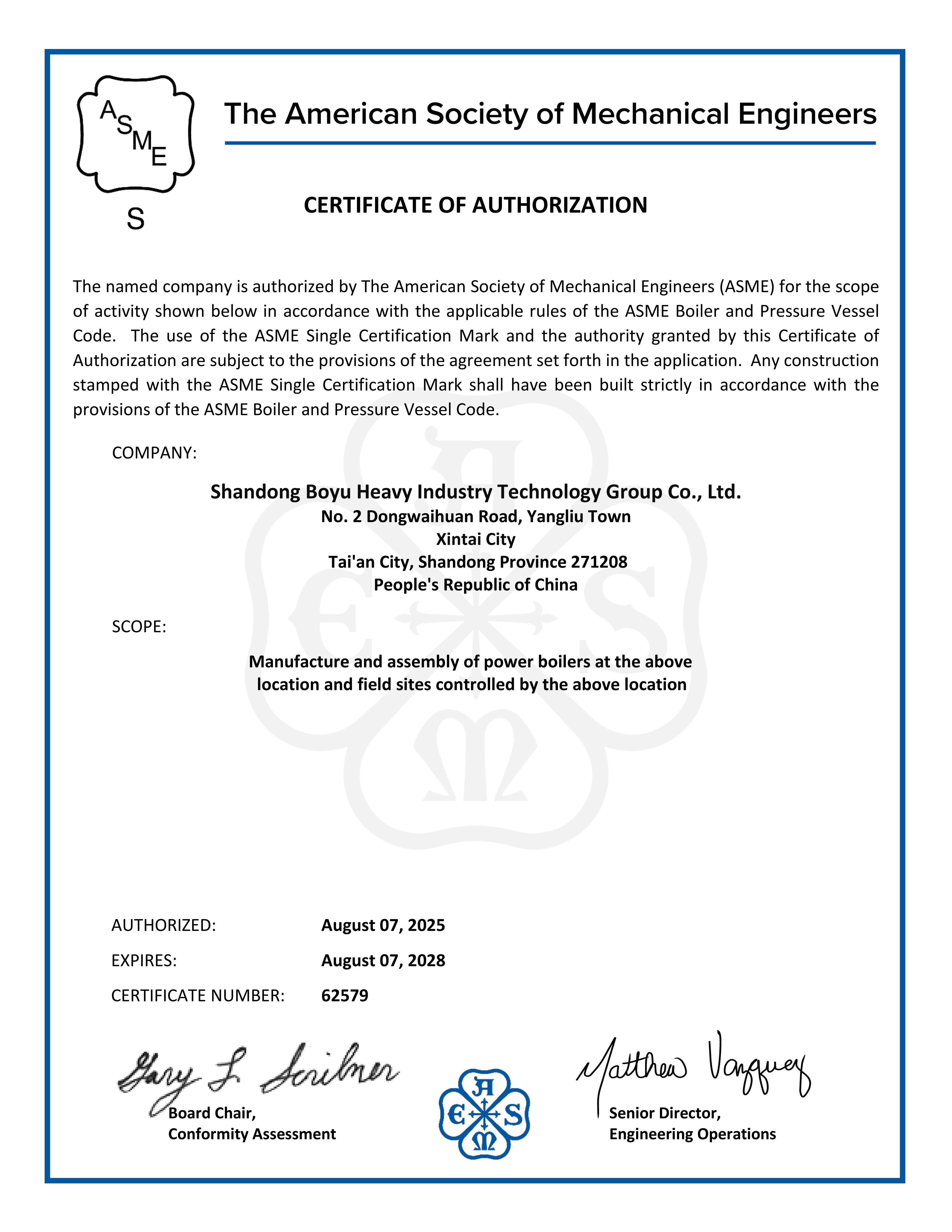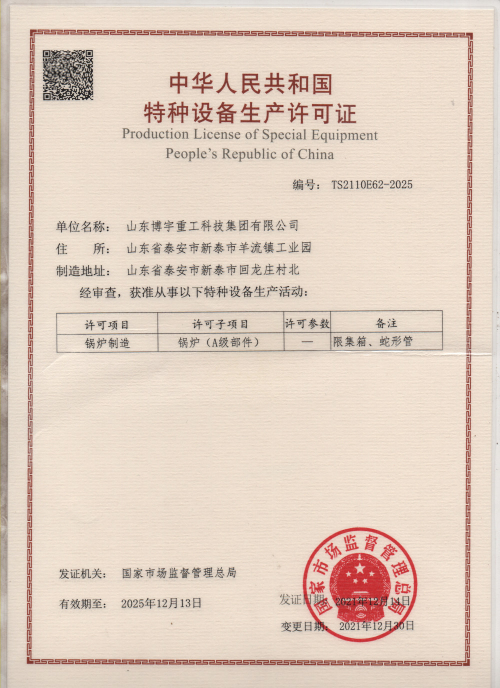 The company operates under the ISO9001 quality management system and the GB/T19580 performance excellence model. It holds an A-grade boiler parts manufacturing license as well as Class I & II pressure vessel manufacturing licenses. In addition, the company has been awarded the ASME “S” and “U” Stamp certificates and possesses a Second-grade license for boiler installation, modification, and maintenance.