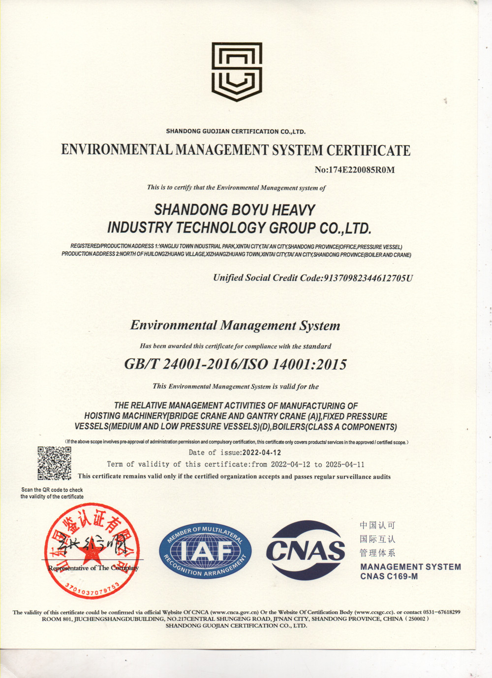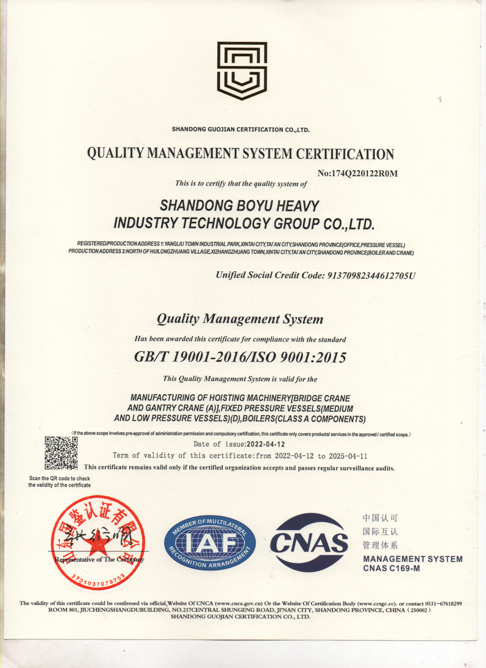 The company carries out ISO9001 quality system and GB/T19580 perfect performance management mode, holding A Grade boiler parts manufacturing license and class I & II pressure vessel manufacturing license. It will get steel stamp certificates for ASME"S" & "U" in a near future and already got second grade boiler installation, modification and maintenance license.